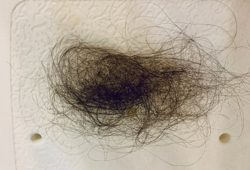 This pile did not sit well either, one week of picking up all that I could to show you how many hairs. It looks like more than 100 per day to me but I’m too impatient and frustrated to count.