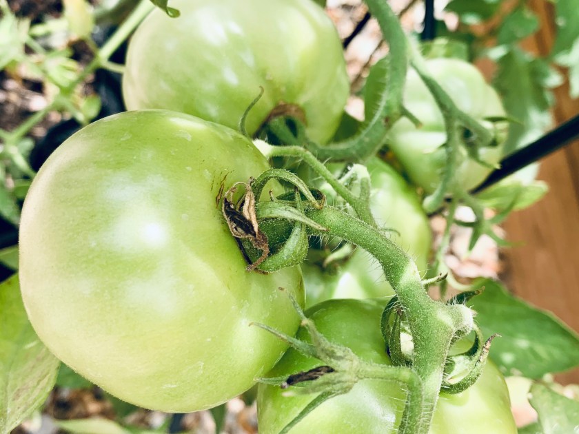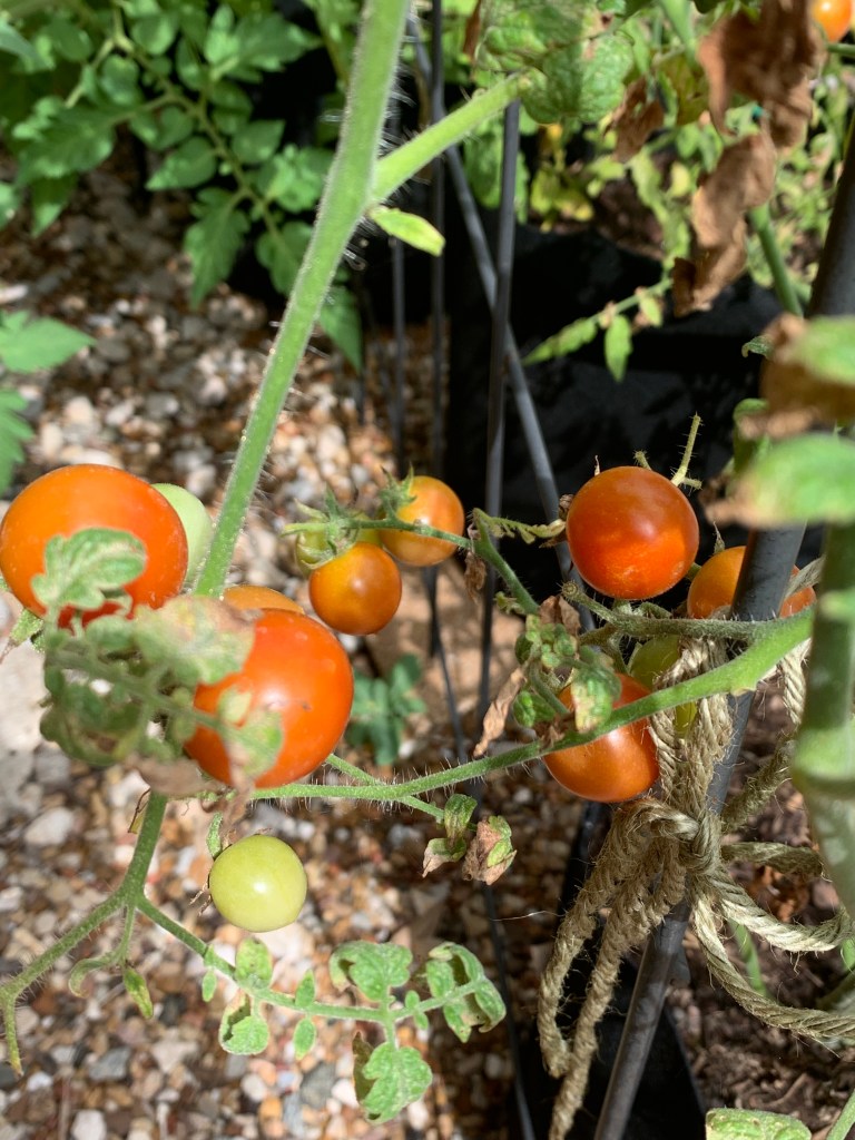 This week I’m sharing our yummy little tomato garden. We have Cheery tomato’s and several other varieties. The Cherry tomatoes have been supplying us for weeks with sweet little ones. I’ve really enjoyed making an egg omelet with fresh tomato and cheese, of course some salsa. The others will ripen another month or so.