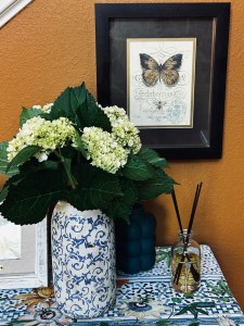 The Hydrangeas didn’t turn out as well as they looked in the editor. But you get a good look at the art piece. I shopped the house to find something to fill in the wall.